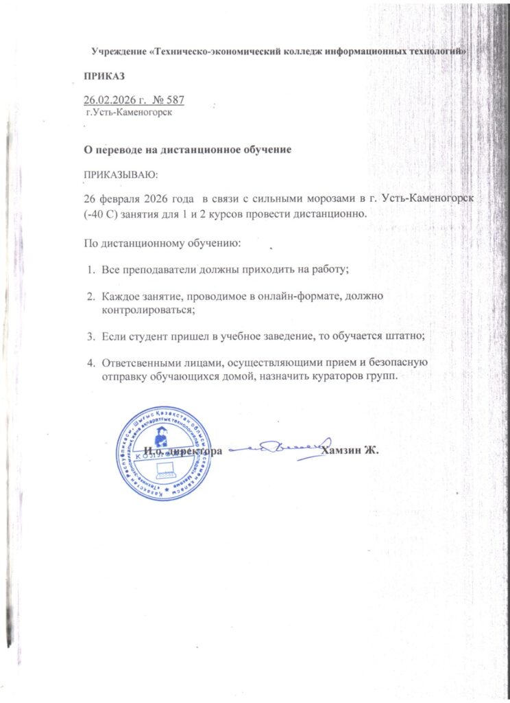 26.02.26 в связи с сильными морозами (-40) ученики 0-11 классов 1 и 2 смены г.Усть-Каменогорска переводятся на дистанционное обучение.